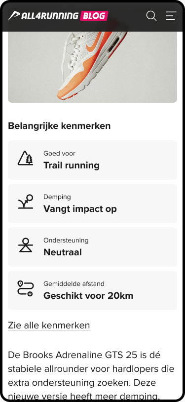 All4running is a company with that has a lot of knowledge to offer. To showcase product information specifically catered to runners I created a component that clearly highlightes specific product features that makes it easy to compare products with one another.