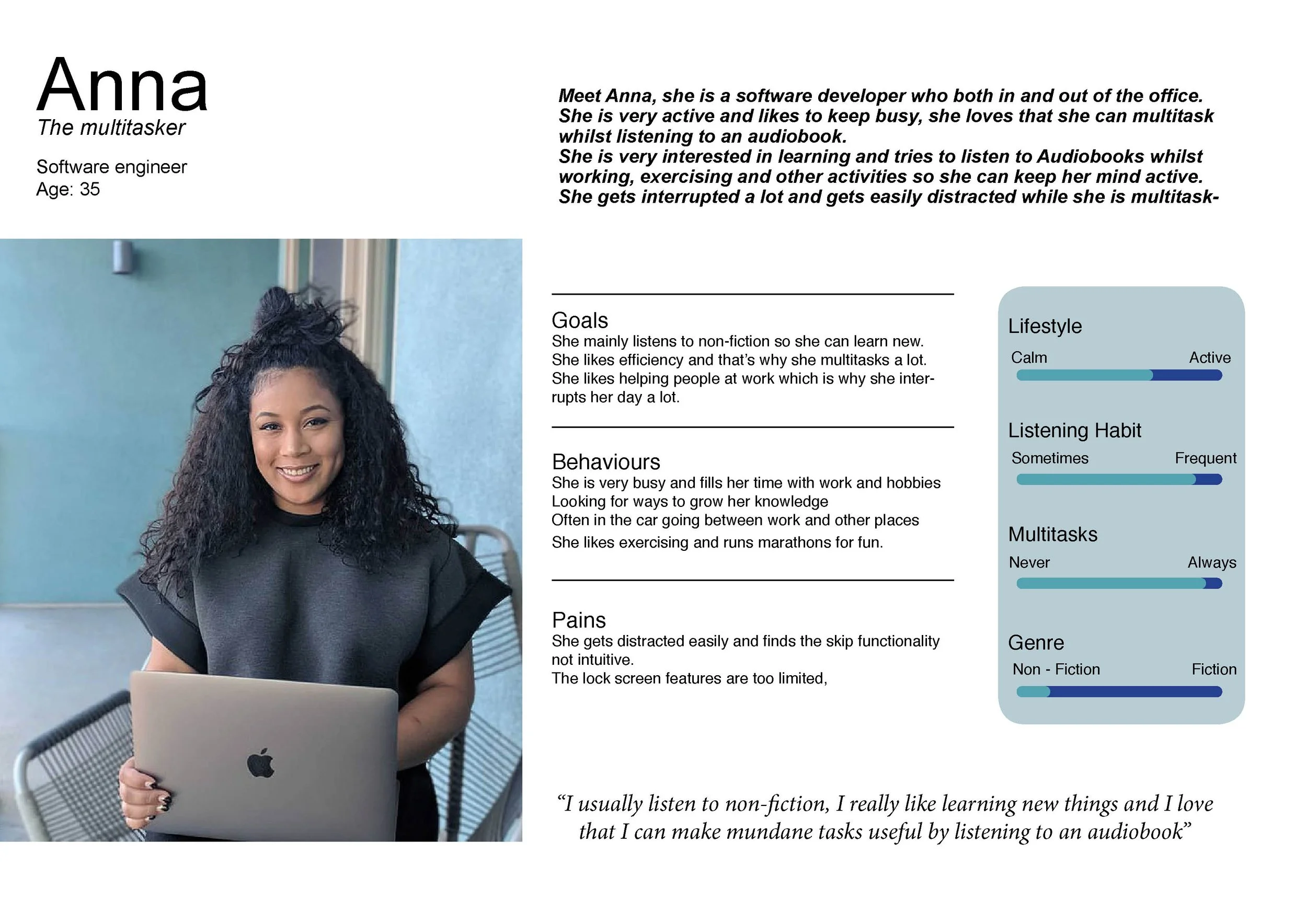 I interviewed frequent users of similar audiobook apps with an age range of 20-40 years old. In these interviews I delved into user experiences frustrations and desires regarding audio navigation in audiobook apps.